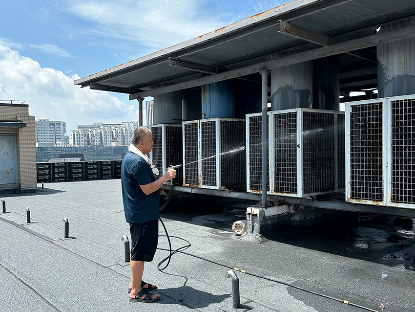 物業部陳仁生頂著烈日為民生店空調機組人工噴水降溫,確保機器運轉。